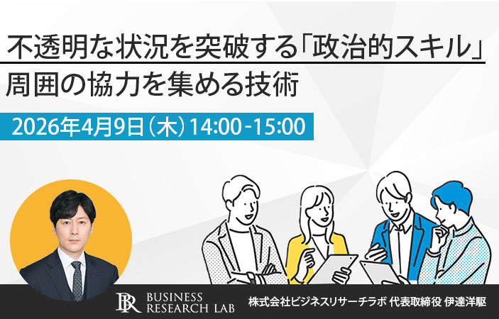 株式会社ビジネスリサーチラボは、2026年4月9日にオンラインセミナー「不透明な状況を突破する『政治的スキル』:周囲の協力を集める技術」を開催します。